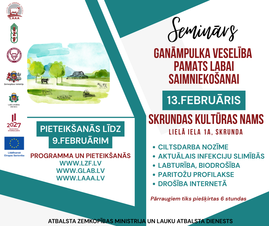 Biedrība “Latvijas aitu audzētāju asociācija” kopā ar biedrībām “Latvijas Zemnieku federācija” un “Gaļas liellopu audzētāju biedrība” aicina uz noslēdzošo semināru lopkopjiem (atgremotāju sugām) "Ganāmpulka veselība - pamats labai saimniekošanai", kurā kopīgi pārrunāsim, kā ar vienkāršiem un pārbaudītiem paņēmieniem rūpēties par savu ganāmpulku, lai dzīvnieki būtu veseli, saimniecība ienesīga un darbs vieglāks.